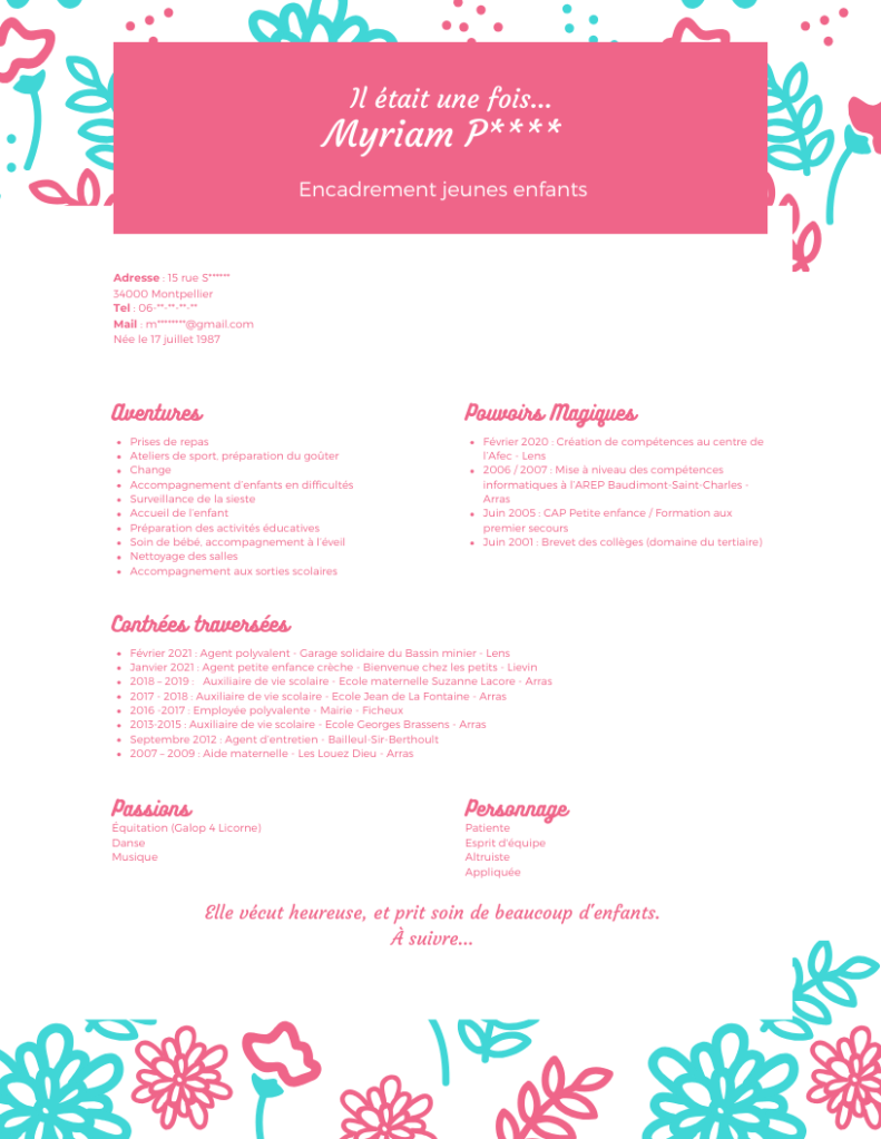 « Un grand merci à Candice qui m’a accompagnée, je n’aurais jamais imaginé qu’un CV puisse me sauter aux yeux comme ça, quelle originalité ! »